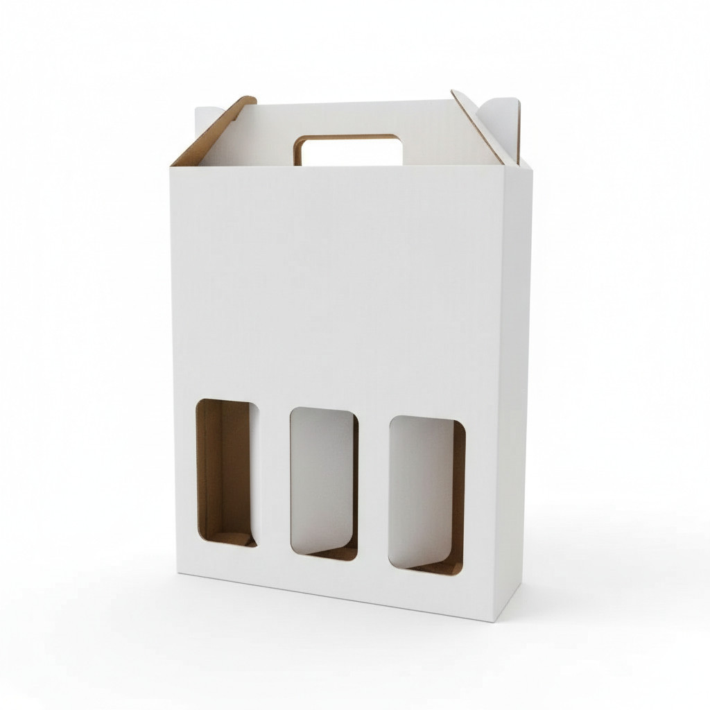 Esztétikus, fehér kartondoboz 3 db bordolese vagy bordói üveg számára, normál ablakkal.