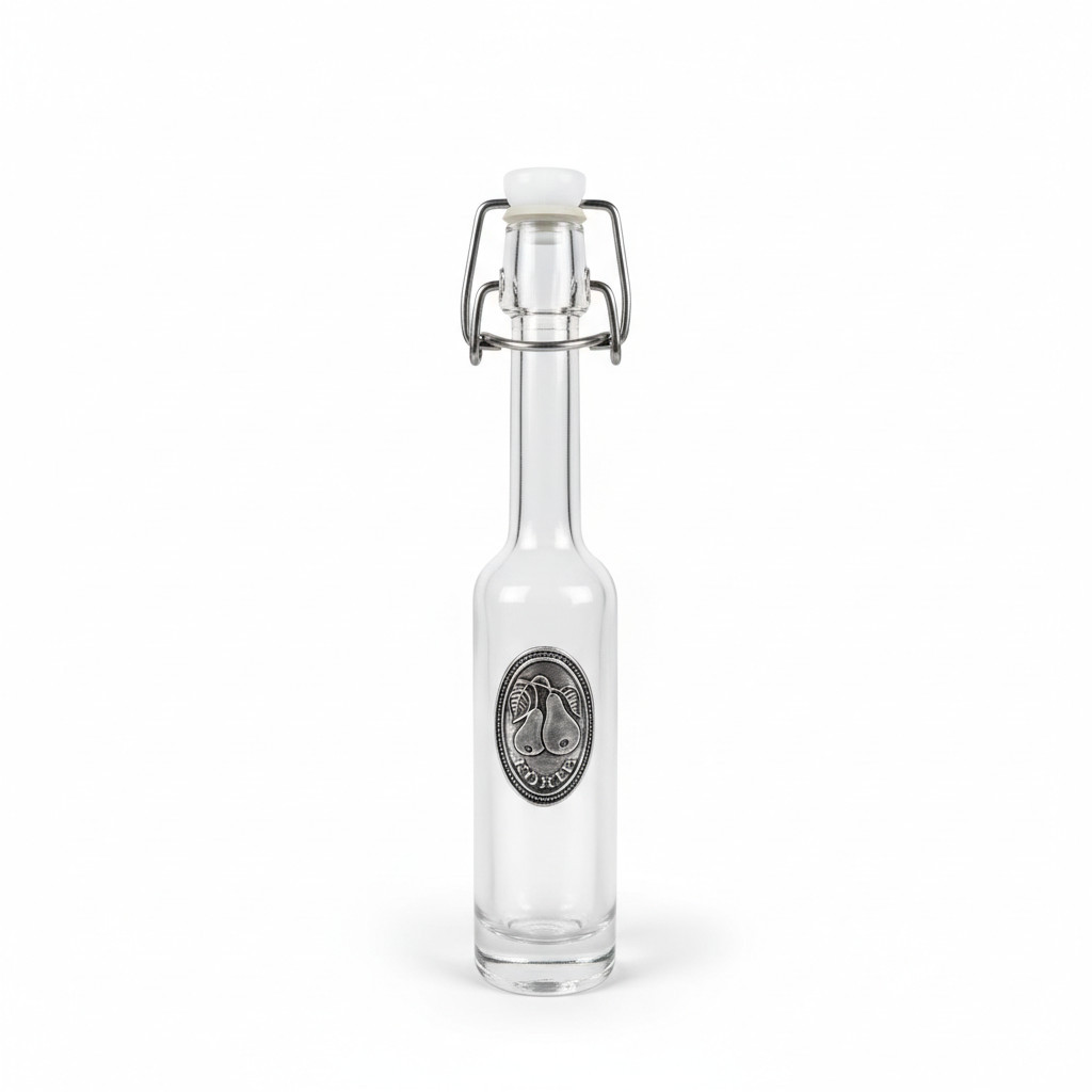 Ez az ón címkés palack nemcsak praktikus, hanem esztétikus kiegészítője lehet bármely bárszekrénynek vagy ajándékcsomagnak. A 0,04 literes kapacitás ideális kis mennyiségű, minőségi italok, mint például pálinkák vagy kézműves likőrök tárolására. A csatos zár biztosítja, hogy az ital frissessége megőrződjön, míg a körte formájú dizájn különleges megjelenést kölcsönöz a palacknak.