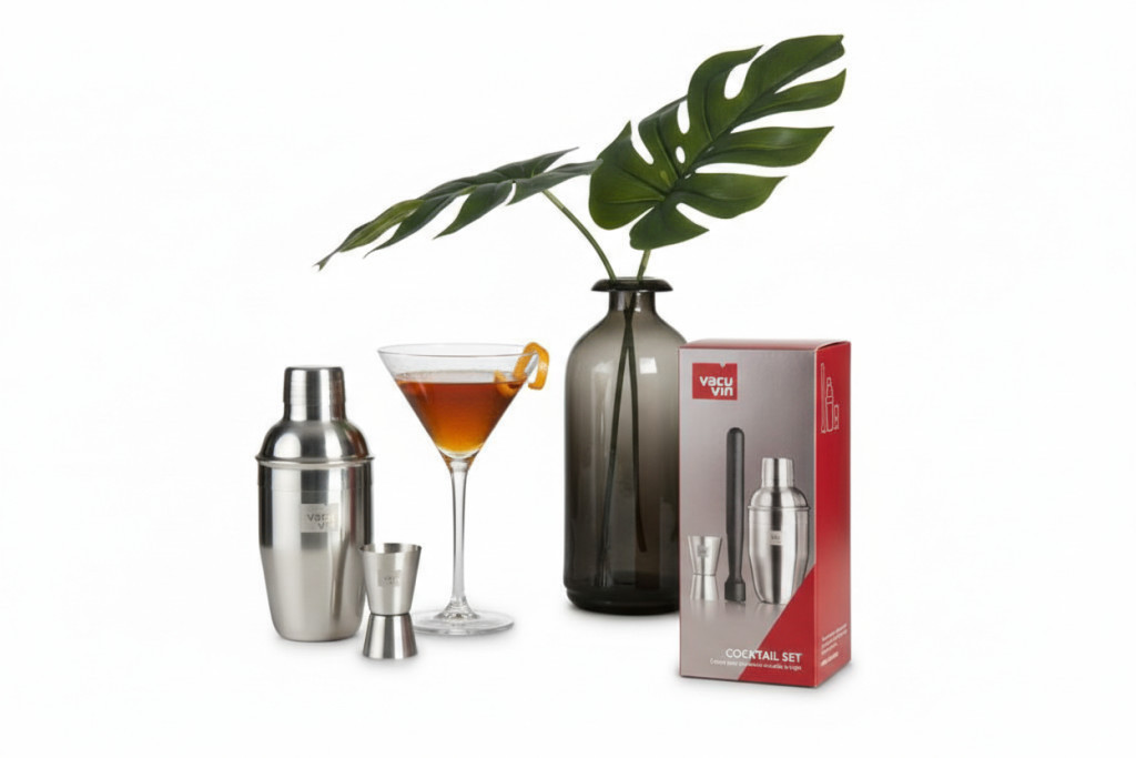 A Vacuvin Koktél szett 3db-os segít abban, hogy bárki otthon is elkészíthesse kedvenc koktéljait, akár úgy, mint a legjobb bárokban. A szett részei közé tartozik egy kis méretű 350 ml-es inox koktél shaker, amely beépített szűrővel rendelkezik, így könnyedén készíthetőek vele a legtisztább italok. A koktél muddler aprítóval egyszerűen törhetők a mentalevelek vagy citrusok, hogy a koktélok íze még intenzívebb legyen. Emellett egy dupla italmérce is található a szettben, amely 15 ml-es és 30 ml-es mérési lehetőséget biztosít, így mindig pontosan adagolhatók az összetevők.